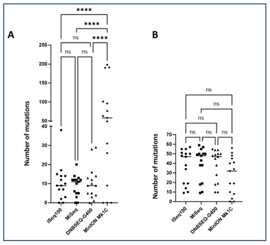 Total number of mutations found after sequencing analysis. (A) Number of minority mutations (>1% to <20%) detected for the four sequencing platforms. (B) Number of majority mutations (>20% to <100%) detected for the four sequencing platforms. The number of mutations was compared between the different platforms. Significant differences determined using one-way analysis of variance (ANOVA) and Tukey’s multiple comparison test as post hoc analysis are indicated by asterisks (**** p ≤ 0.0001, ns p > 0.05). A Bartlett correction is applied for multiple comparisons.