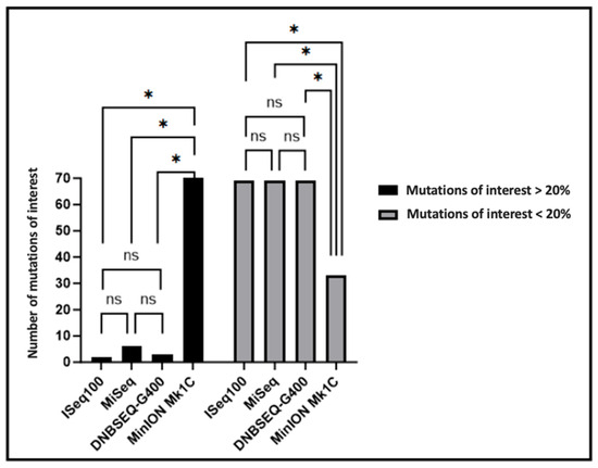Total number of majority (>20% to <100%) and minority (>1% to <20%) mutations of interest detected for the four sequencing platforms. The number of mutations was compared between platforms. Significant differences determined using two-way analysis of variance (ANOVA) and Sidak’s multiple comparison test as post hoc analysis are indicated by asterisks (* p ≤ 0.05, ns p > 0.05).