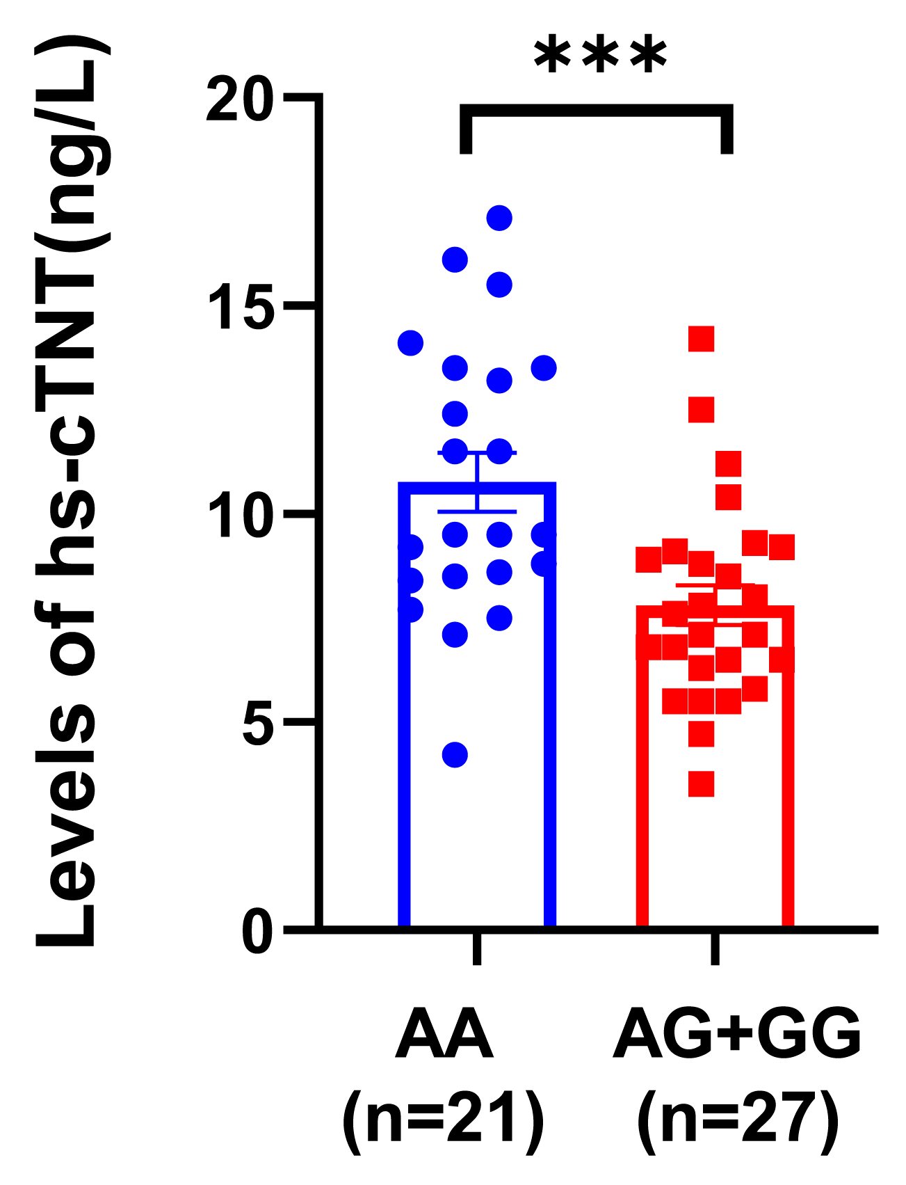 3.5. The Risk A Allele of rs3737883 Is Associated with a Higher Serum hs-cTnT Level in AF Patients