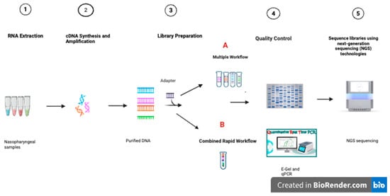 Using the Illumina COVIDSeq Kit (Catalogue No. 20065135, San Diego, CA, USA) library preparation reagents, DNA amplicons were tagmented with bead-linked transposomes. The tagmentation reaction was stopped with a tagmentation stop buffer before proceeding to the post-tagmentation purification, using the tagmentation wash buffer. This step was followed by amplifying the tagmented DNA with an enhanced PCR mix, and Illumina UD index adapters (set B) were used. The libraries were then pooled into four tubes according to their viral types. Five microlitres (5 μL) of the two Influenza samples were pooled into one tube, and the same was performed for the remaining three virus types, resulting in four libraries as indicated in Figure 1A. The four pooled libraries were then purified using IPB, followed by two ethanol washes with each library eluted in 13.0 μL of resuspension buffer (RSB). Libraries were then quantified using the Qubit dsDNA High Sensitivity assay kit on a Qubit 4.0 fluorometer instrument (Thermosfisher, Waltham, MA, USA). The library fragment size was then visualised using the E-Gel Power Snap electrophoresis device, run according to the manufacturer’s protocol on an E-Gel EX 1–2% cassette (Thermosfisher, Waltham, MA, USA). The four libraries were diluted to 4 nm using RSB before quantification, using the Takara qPCR Library Quantification Kit (Takara Bio Inc., Shiga, Japan). Based on the qPCR quantifications, the four libraries were normalised and pooled. The pooled library was then diluted to 650 pM and spiked with 1% PhiX control before sequencing on the Illumina NextSeq2000 platform (Illumina, San Diego, CA, USA), using a NextSeq P1 flow cell Kit (300 cycles) at the KwaZulu-Natal Research Innovation and Sequencing Platform (KRISP) in South Africa.
