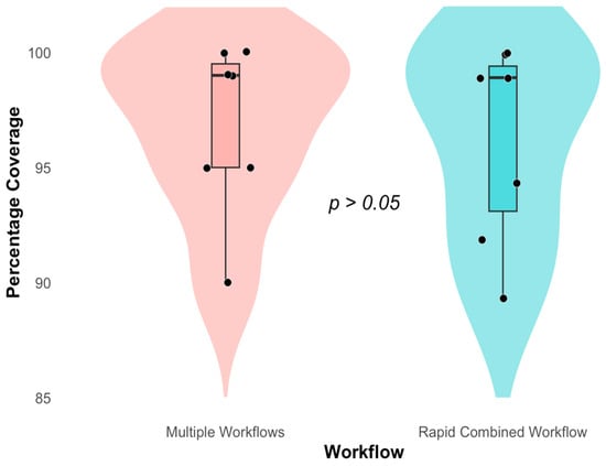 There was near full genome coverage depicted in Figure 4, genome coverage (%) for the multiple and rapid workflow. SARS-CoV-2 (1) exhibited near-complete genome coverage of 99.7% in the multiple workflow and 98.9% in the rapid workflow. SARS-CoV-2 (2) followed with 95.2% and 91.9% coverage. Rhinovirus A16 showed similar genome coverage between workflows—94.6% for multiple and 94.3% for rapid. Rhinovirus A1 maintained equal genome coverage of 98.9% across both workflows. RSV A had the lowest genome coverage overall, with 90.3% in the multiple workflow and 89.3% in the rapid workflow—the Wilcoxon Rank Sum Test between the multiple and rapid combined workflows (W = 29.5, p = 0.5631).
