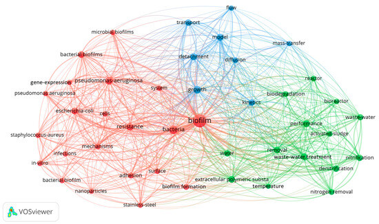 Figure 1 provides a comprehensive overview of key themes and keywords within the research domain of biofilm engineering, shedding light on various aspects that define the breadth and depth of this biofilm engineering field. The depicted keywords encompass a spectrum of entities, including specific microbial species that play a pivotal role in biofilm formation and dynamics. Notable examples include “Escherichia coli”, “Pseudomonas aeruginosa”, and “Staphylococcus aureus”, reflecting the microorganisms under scrutiny within the context of biofilm engineering.