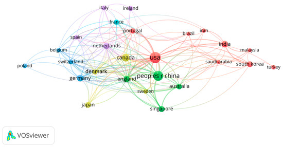 The VOSviewer displays the main countries or regions working in the biofilm engineering field. Colors in these networks indicate different clusters, while the lines indicate international collaboration. Larger circles signify a greater number of publications.