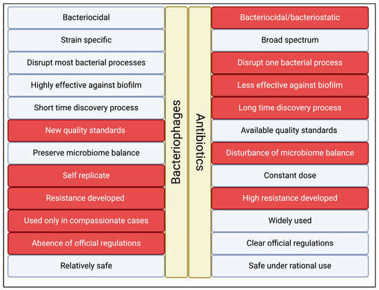 The advantages (blue) and disadvantages (red) of bacteriophages versus traditional antibiotics.