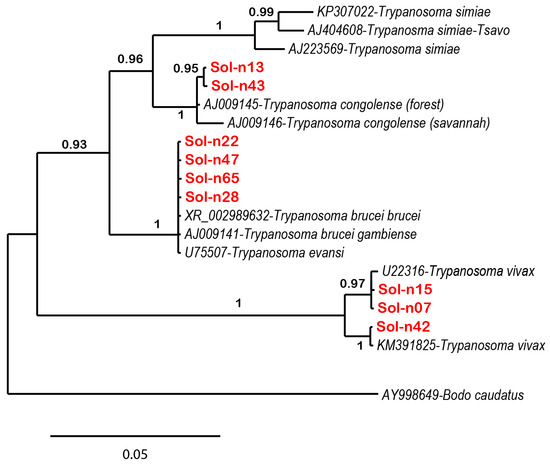18S rRNA-based phylogeny of trypanosomes from Allochrocebus solatus. Maximum likelihood tree with bootstrap values for 1000 replicates. 18S rRNA sequences generated in this study are in red, and Genbank sequences are accession numbers before the parasite names. Each sequence is labeled with the A. solatus number (e.g., Sol-n13, accession number: PV425447-PV425455).