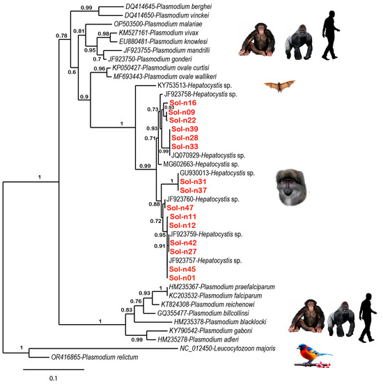 Malaria parasite infection prevalence detected by PCR targeting cytochrome b was 34.0% (16/47) among the analyzed blood samples. Of the 16 positive individuals, 25% (7/28) were adults, compared to 47.3% (9/19) in juveniles. However, the difference in infection rates between adults and juveniles was not statistically significant (p = 0.13). Only Hepatocystis spp. parasites were found in monkeys (Figure 3), previously identified in monkeys and bats in Africa, particularly in mandrills in Gabon.
