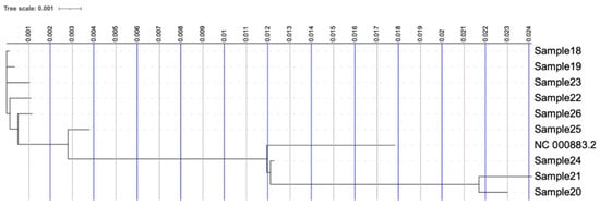Phylogenetic tree of the nine clinical isolates and the reference Human Parvovirus B19 genome (NC_000883.2).