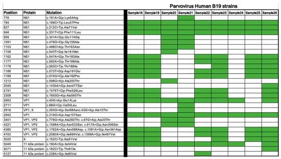 Missense coding variants of the Human Parvovirus B19 strains. The presence of the listed mutations in each strain is shown in green.
