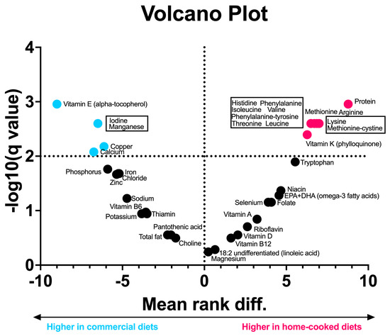 Volcano plot of significant dietary features identified in a retrospective cohort of dogs with aminoaciduric canine hypoaminoacidemic hepatopathy syndrome (ACHES). Multiple Mann–Whitney tests compared nutrient inclusions between home-cooked and commercial diets. All p values were <0.01 for nutrients with −log10 q values > 2, indicated by the horizontal dotted line. Higher −log10 q values reflect smaller adjusted p values accounting for multiple comparisons. The vertical line represents the baseline for differences (as mean ranks) between nutrients between home-cooked and commercial diets. Nutrients of equal mean rank difference boxed together.