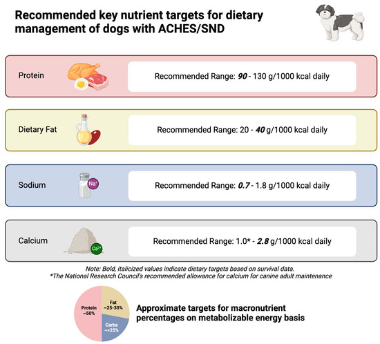 Recommendations for nutrient targets for dogs with aminoaciduric canine hypoaminoacidemic hepatopathy syndrome (ACHES). Target ranges were determined as described in the methods. The authors recommend practitioners collaborate with, or refer clients to, a Board Certified Veterinary NutritionistTM to formulate home-cooked diet recipes that meet other nutrient targets consistent with life-stage or necessary modifications in cases with nutritionally relevant concurrent disease(s). Created with BioRender.com.