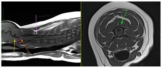 Example of a T1-weighted MRI of an 8-year-old Chihuahua. Yellow arrow—dilatation of the 4th ventricle; orange arrow—Chiari-like malformation; purple and green arrow—a large syrinx with a diameter of 3.1 mm. Taken with a 1.5 T MRI scanner.