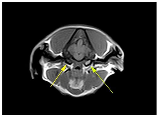 Example of a T1-weighted MRI of a 3-year-old King Charles Spaniel. Yellow arrows—MEE. Taken with a 0.4 T MRI scanner.