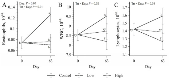 Blood counts on days 0 and 63 for: (A) eosinophils, (B) white blood cells, and (C) lymphocytes. Control group was supplemented with 15 g/d of ground corn germ, while Low and High groups received either 7.5 g/d or 15 g/d, respectively, of S. cerevisiae postbiotic supplement (A-Max Xtra, Church and Dwight Co., Inc., Ewing, NJ, USA). Superscripts a and b denote significant differences among treatment × time interaction (p < 0.05), while superscripts x and y denote trending differences in treatment × time interaction (0.05 < p < 0.08).