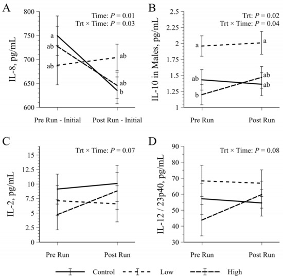 Treatment significantly (p < 0.01) affected MCP-1 concentrations: serum levels were significantly increased in Low compared to High and tended to differ compared to Control. However, there were no interaction effects of exercise with treatment on MCP-1 concentrations (p ≥ 0.41). Treatment produced a similar effect on serum IL-10 in males, with the Low group having significantly elevated concentrations compared to both the Control and High groups (p = 0.02). Females did not show a significant treatment effect but tended to have decreased circulating IL-10 in Low compared to Control, with High being intermediate (p = 0.06). There was a significant treatment × timepoint interaction for IL-10 in males, where concentrations in the High group were significantly lower pre-run but then increased post-run to be similar to the Low (p = 0.04, Figure 4B). This response was not seen in the females (p = 0.63). There was also a significant treatment × timepoint interaction for IL-8 during the initial run (p = 0.03, Figure 4A) where concentration after the initial run decreased in Control while Low and High treatments did not differ. Numerically, the High group also decreased in IL-8 post-run but Low increased. There were trending treatment × timepoint interactions for IL-2 (p = 0.07, Figure 4C) and IL-12 (p = 0.08, Figure 4D), both of which followed a similar pattern to that of males’ serum IL-10 but were not trending when assessed with Tukey’s post hoc (p ≥ 0.27).