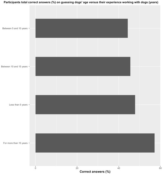 Dog specialist correct dogs’ age predictions (%) based on the specialist’s time of experience with dogs (from photographic data).