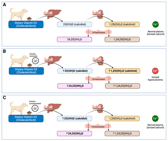 Graphical representation of circulating vitamin D metabolites pathways and proposed alterations in cholecalciferol toxicoses based on two cases in dogs. (A) Normal metabolic conversion of dietary vitamin D3 (cholecalciferol) into 25(OH)D (calcidiol) and finally into 1,25(OH)2D (calcitriol) through the actions of 25-hydroxylase and 1a-hydroxylase, respectively. (B) Established mechanism for hypercalcemia-associated morbidity and mortality from excess cholecalciferol ingestion: increased activity of 25-hydroxylase and 1a-hydroxylase results in excess 1,25(OH)2D (calcitriol) and subsequent hypercalcemia. (C) Proposed mechanism for 24-hydroxylase-mediated tolerance of excess cholecalciferol ingestion: increased activity of 24-hydroxylase offsets the increased activity of 25-hydroxylase, resulting in normal conversion of 25(OH)D (calcidiol) and into 1,25(OH)2D (calcitriol) and maintaining normocalcemia. Created in Biorender.com.