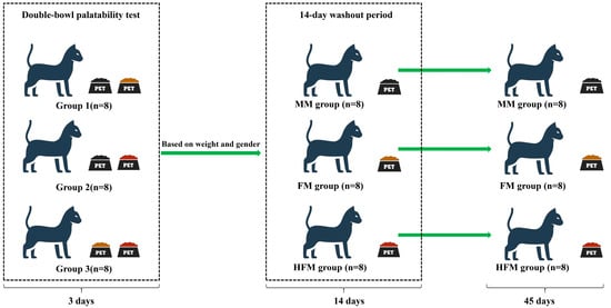 At the end of the palatability experiment, cats were given the next test after a 14-day washout period to investigate the effects of MM, FM, and HFM in the diet on apparent digestibility, immune response, fecal microbiota, and metabolome. During the washout period, each group of cats was fed a different experimental diet according to group. We divided 24 cats into three groups based on weight and gender. Food was weighed and offered to the cats at 8:30 a.m. every day. Maintenance energy requirements (MERs) were calculated from the cat’s body weight, and each cat was fed according to its MER, calculated as MER = 75 × kg body weight (BW)0.67. Fresh water was available ad libitum. To determine food intake (g/d), we weighed and recorded the remaining food each day. The experiment lasted 45 days, including the last three days of sample collection (Figure 1).