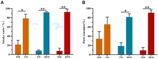 Intake ratio (%) (A) and first consumption choice (%) (B) of cats (MM: n = 8; FM: n = 8; HFM: n = 8) fed experimental diets containing MM, FM, and HFM. The symbol (*) indicates statistically significant differences between two groups (* p< 0.05 and ** p < 0.01).