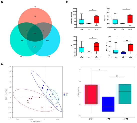 Gut microbial composition and structure of cats (MM: n = 6; FM: n = 6; HFM: n = 8) fed experimental diets containing MM, FM, and HFM. Venn diagram of fecal samples in each group (A); alpha diversity (B); principal co-ordinate analysis (PCoA) based on weighted UniFrac distances (C). The symbol (*) indicates statistically significant differences between two groups (* p < 0.05 and ** p< 0.01).