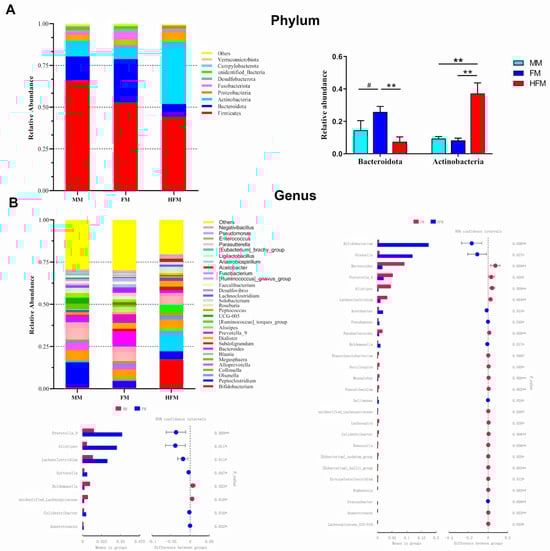 Predominant fecal microbial communities and different bacteria at the phylum (A) and genus levels (B) in cats (MM: n = 6; FM: n = 6; HFM: n = 8) fed experimental diets containing MM, FM, and HFM. The symbol (*) indicates statistically significant differences between two groups (* p < 0.05 and ** p< 0.01), and the symbol (#) represents the difference tendency (# p < 0.10).