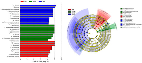 The LEfSe analysis further confirmed the differential microbiota abundances. The histogram with a logarithmic LDA score > 4.0 and cladogram are shown in Figure 5. Firmicutes, Bacteroidota, and Actinobacteria were the predominant phyla in the MM, FM, and HFM groups, respectively. In the MM group, Peptoclostridium, Lachnospiraceae, Oscillospiraceae_UCG_005, Collinsella_stercoris, and Ruminococcus_torques_group had the highest abundance. Bacteroides, Alistipe, and Lachnoclostridium were the predominant bacterial strains in the FM group. Finally, Bifidobacterium and Olsenella were the highest-abundance microbiota in the HFM group.