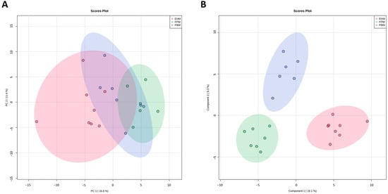 Multivariate statistical analysis of metabolites in cats fed experimental diets containing MM, FM, and HFM. Score plots from the principal component analysis (PCA) model among the three groups (A). Score plots from the partial least-squares discriminant analysis (PLS-DA) model among the three groups (B).