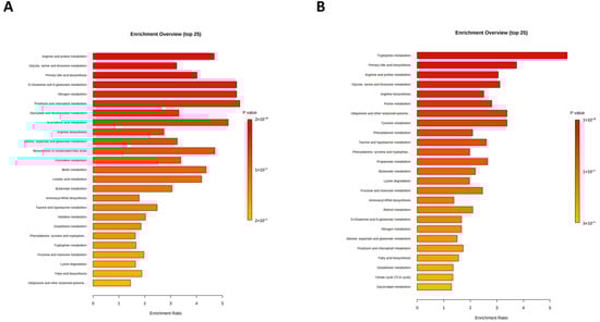 Bar charts of the metabolic pathway analysis of differential serum metabolites between the MM and FM groups (A) and between the FM and HFM groups (B).