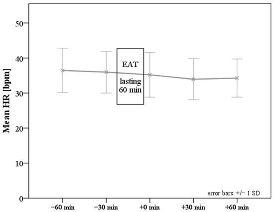HR (±SD) of therapy horses (N = 7) at different time points (x-axis) under the experimental condition. The box indicates the time when an EAT group session took place.