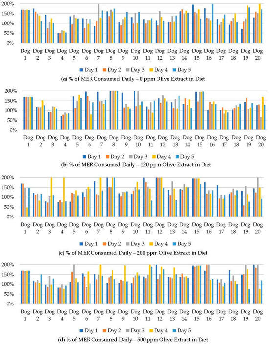 Food consumption as a percentage of daily metabolic energy requirements (MER) for Beagle dogs fed kibble diets with (a) 0 ppm, (b) 120 ppm, (c) 200 ppm, and (d) 500 ppm olive extract as a flavor component.
