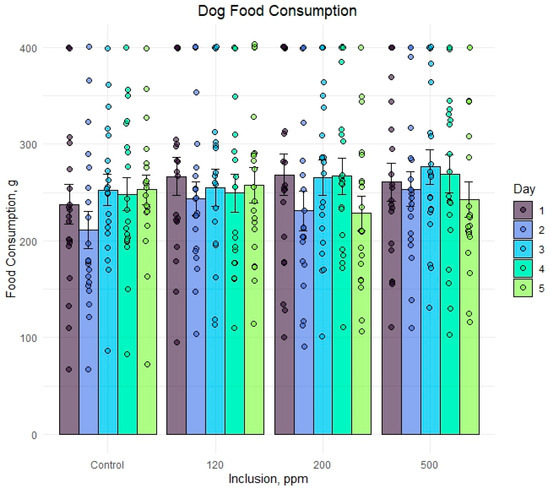 Dog food consumption when offered diets with 0, 120, 200, or 500 ppm olive extract as a flavor component. Data bars represent the mean food consumption ± standard error of the mean. Data points within a treatment and timepoint represent food consumption for an individual dog.