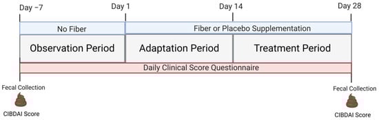 Schematic timeline. Dogs with chronic enteropathy were randomized to receive either wheat dextrin or placebo powder mixed with their food daily for 28 days. Dogs were monitored for 7 days prior to starting the study powder supplement (observation period). Dogs received the study powder supplement once daily mixed with their food for total of 28 days, including a 14-day period of gradually increasing amount of daily powder supplement to the maximum dose (adaptation period). Voided fecal samples were collected before and on the 28th day of powder supplementation.