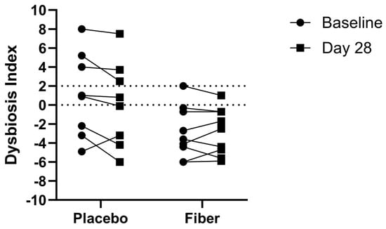 At baseline in the placebo group, three dogs had normal DI, two dogs had mild to moderate changes, and three dogs had significant dysbiosis. After placebo supplementation for 28 days, most dogs had similar DI values to baseline except that two dogs that had a normal DI at baseline experienced minor changes. At baseline in the fiber group, all dogs except one dog (eight of nine) had a normal DI. This dog had mild to moderate dysbiosis based on a DI value of 2.0. On day 28 of fiber supplementation, DI values were similar in most dogs except one dog had experienced minor changes, and this dog continued to have mild to moderate dysbiosis (Figure 2).