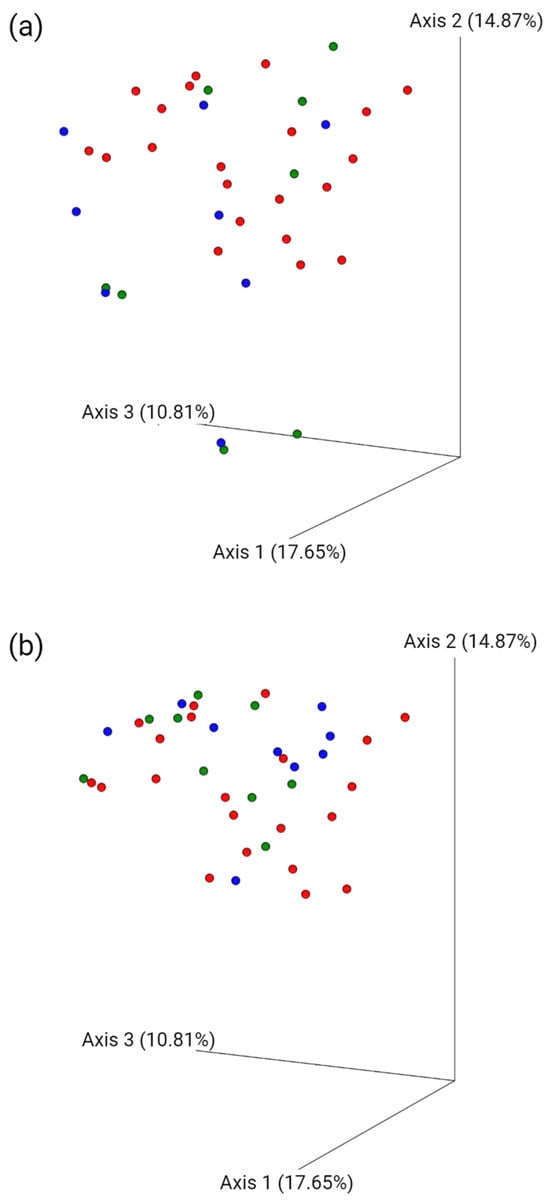 Three-dimensional representation of principal coordinate analysis (PCoA) plots of Bray–Curtis dissimilarity index for healthy dogs and dogs that received (a) placebo powder or (b) wheat dextrin powder mixed with their food for 28 days. Each dot represents a fecal sample (green: baseline; blue: day 28; red: healthy dogs).