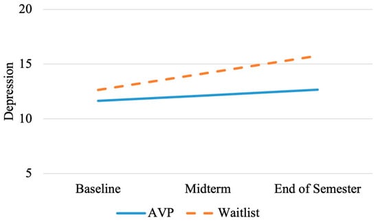 Model fit statistics of the multiple linear regression analyses (Table 2—part 2), F(3,100) = 0.24, p = 0.87, R2 = 0.01, indicated there was no significant effect on students’ anxiety slope between participants’ treatment condition, B = 0.15, p = 0.93, d = 0.02, high SA status, B = −1.08, p = 0.42, d = 0.16, and program attendance status, B = −0.06, p = 0.98, d = 0.01. Predicted anxiety slopes showed similar declines over time in both the AVP and waitlist conditions. This suggests that participation in three or more sessions of drop-in AVP was insufficient to influence trajectory slopes for anxiety.