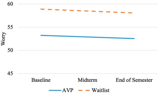 Model fit statistics (Table 2—part 3), F(3,101) = 3.36, p = 0.022, R2 = 0.09, indicated there was a significant effect on students’ worry slope between participants’ treatment condition, high SA status, and program attendance status. Results show that random assignment to the PAWs4US condition predicted a significantly flatter worry trajectory slope over time, B = −3.92, p = 0.04, d = 0.42, while controlling for presence of high SA, B = 1.33, p = 0.38, d = 0.17, and program attendance, B = 6.22, p < 0.001, d = 0.62. Predicted slopes, displayed in Figure 2, show a negative slope for students randomly assigned to the AVP condition, M = −1.58, SD = 3.01, indicating decreasing levels of worry over time, compared to a slightly flatter negative slope—albeit minimally observed—for the waitlist condition, M = −0.59, SD = 0.60. The graphic representation confirms that there was a significant difference in mean levels of worry at baseline, which were confirmed in a t-test analysis (t = −2.67, p = 0.008). Waitlisted students (M = 58.89, SD = 11.53) reported significantly higher levels of worry at the start of the semester compared to AVP participants (M = 53.25, SD = 13.34). It is important, however, to note that the initial levels of worry by condition are considered in the calculated slope trajectories.
