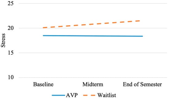 Despite a lack of significant model fit statistics (F(3,100) = 1.28, p = 0.28, R2 = 0.04), regression results (Table 2—part 4) suggest that AVP exposure predicted marginally flatter trajectory slopes of stress over time, B = −1.94, p = 0.05, d = 0.39, while controlling for presence of high SA, B = 0.10, p = 0.90, d = 0.03, and program attendance, B = 1.40, p = 0.19, d = 0.26. Figure 3, displaying predicted slopes, shows trajectory slopes for the AVP condition as relatively flat with a slight negative slope M = −0.37, SD = 0.69. In contrast, trajectory slopes for waitlisted students suggest that students experience increasing levels of perceived stress over time, M = 0.90, SD = 0.05. This suggests that repeated exposure to drop-in AVP during students’ first semester on campus may gradually reduce students’ perceived stress during the transition to college.