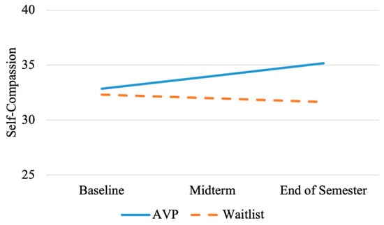 Model fit statistics of the multiple linear regression analyses, F(3,99) = 3.21, p = 0.03, R2 = 0.09, indicated there was a significant effect on students’ self-compassion slope between participants’ treatment condition, high SA status, and program attendance status. Results show that random assignment to the AVP condition predicted a significantly steeper trajectory slope for self-compassion over time, B = 4.03, p < 0.001, d = 0.61, while controlling for the presence of high SA, B = −0.81, p = 0.45, d = 0.15, and program attendance, B = −3.63, p = 0.01, d = 0.51. Figure 4, displaying predicted slopes, shows a steeper positive slope trajectory for students assigned to the AVP condition, M = 1.96, SD = 1.76, suggesting that they experienced higher levels of self-compassion as the semester progressed. This is compared to students in the waitlist condition who had a flat slightly negative slope trajectory, M = −0.36, SD = 0.37, suggesting they experienced gradual and slight decreases in self-compassion throughout the semester. Note that the effect of program attendance is significantly important, suggesting that higher levels of attendance contribute to steeper slopes. This shows that participation in drop-in AVP promoted students’ self-compassion, a factor related to resilience, during their first semester on campus.