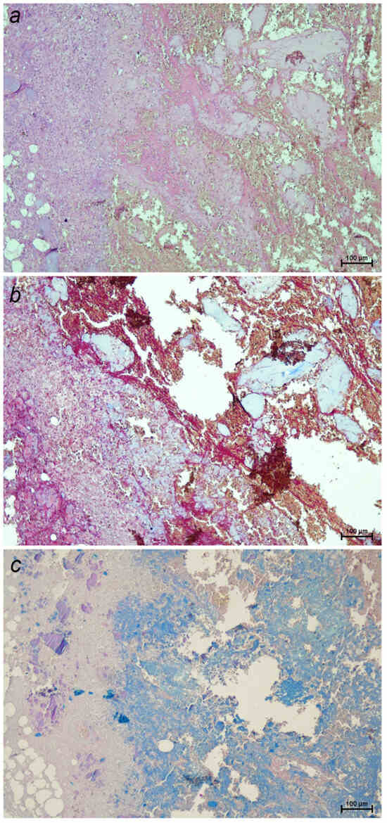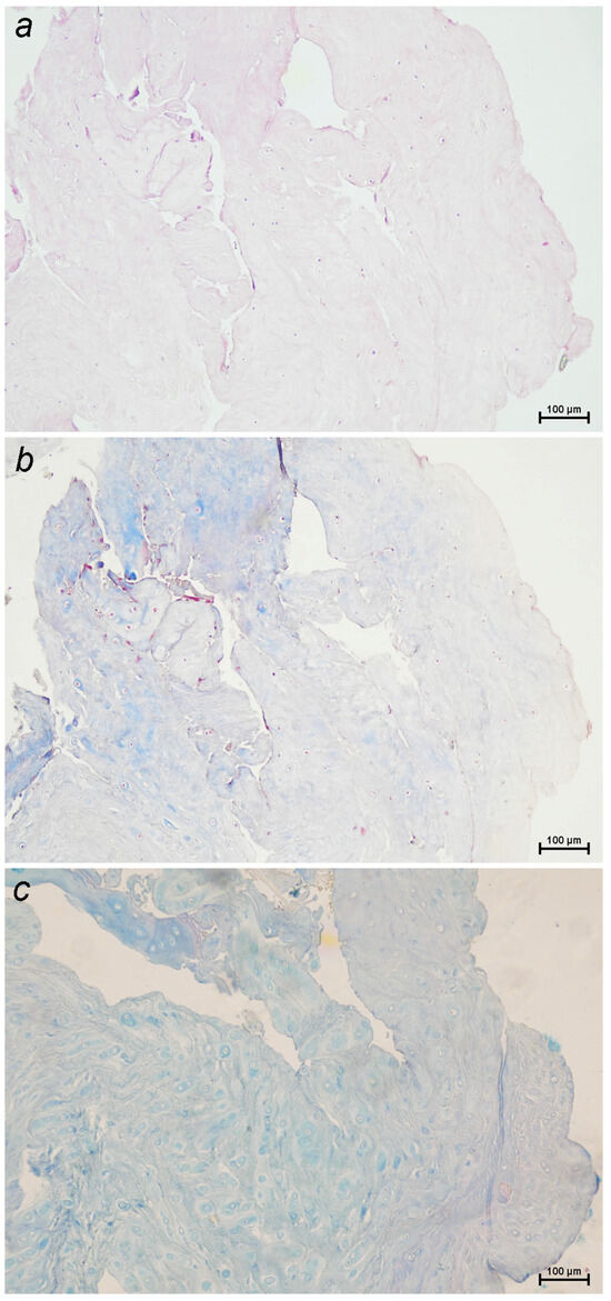 Sections of a canine intervertebral disc extrusion with a high degree of degeneration stained with: (a) hematoxylin–eosin, highlighting general tissue architecture and cellular detail; (b) Masson’s trichrome, which stains collagen fibers blue and cytoplasm, muscle, keratin, and inflammatory cells red, making it useful for assessing both fibrosis and inflammatory infiltration; (c) Alcian blue–PAS, which stains acidic mucopolysaccharides blue and neutral mucopolysaccharides magenta, aiding in the identification of proteoglycans and the cartilage matrix (10×).