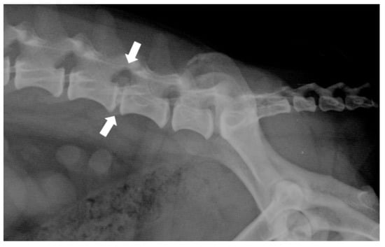Plain radiographs (Figure 3) are a commonly used tool in the veterinary clinic, although they show notable limitations in the evaluation of disc extrusions. Radiographic findings associated with extrusions include reduction of the IVD space, narrowing of the facet joints, opacity of the intervertebral foramen, presence of mineralized disc material in the vertebral canal, and vacuum phenomena. Although radiographs achieve an accuracy of between 51% and 94.7% in the identification of the herniated disc space, they do not provide sufficient information on the extent of extrusion, lateralization, nor the degree of spinal cord compression. Therefore, they are not suitable as an exclusive diagnostic tool, and their usefulness is limited to ruling out other spinal diseases [38].