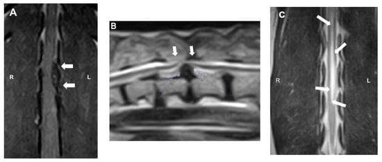 Magnetic resonance imaging (MRI) images: (A) dorsal T1W image showing the hypointense compressive material (arrows) at L2-3; (B) sagittal T2W image showing a severe ventral extradural compression in the ventral aspect of the vertebral canal at the intervertebral T13-L1 (arrows); (C) dorsal T2W image showing ill-defined intramedullary hyperintensity consistent with myelomalacia centered over L1–4 (arrows).