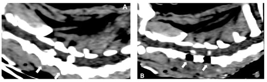Sagittal reconstructed non-contrast CT images of a dog presenting with two simultaneous cervical disc herniations (C3-4 and C4-5) (arrows): (A) pre-surgical and (B) post-surgical.