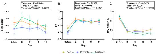 Fresh fecal characteristics, including fecal scores (A), fecal pH (B), and fecal dry matter percentage (C) of live B. pumilus SG154 or L. paracasei 327 postbiotic-supplemented dogs before and after an abrupt diet change. Samples were collected before and 2, 6, 10, and 14 days after the diet change.