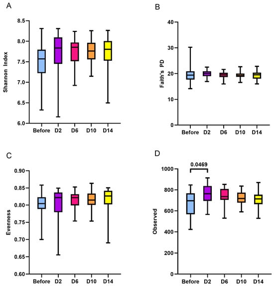 Bacterial alpha diversity indices (by time) [Shannon Index (A), Faith’s PD (B), evenness (C), and observed features (Observed) (D)] of fecal samples from dogs supplemented with live B. pumilus SG154 or L. paracasei 327 postbiotic before and after an abrupt diet change.