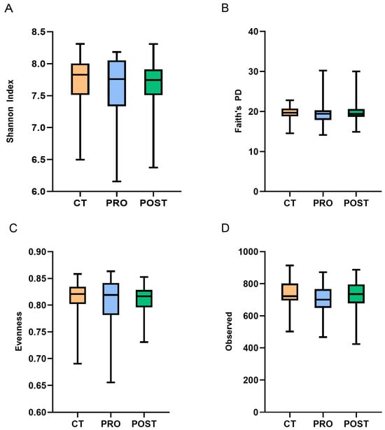 Bacterial alpha diversity indices (by treatment) [Shannon Index (A), Faith’s PD (B), evenness (C), and observed features (Observed) (D)] of fecal samples from dogs supplemented with live B. pumilus SG154 or L. paracasei 327 postbiotic before and after an abrupt diet change (average of all time points).