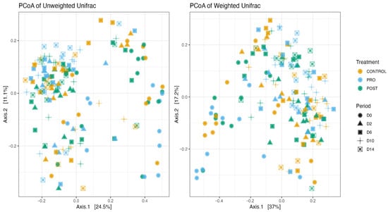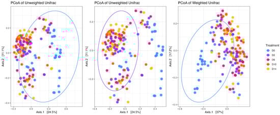 Most bacterial alpha diversity measures (i.e., Shannon Index, Faith’s PD, or evenness) were unchanged after the diet transition (Figure 2A–C). One measure of alpha diversity, observed features, was higher (p < 0.05; Figure 2D) 2 days after the diet change than the baseline. However, bacterial alpha diversity was not different due to treatment following the diet change (Figure 3). Despite the small change to alpha diversity measures, beta diversity was dramatically altered by diet change (Figure 4 and Figure 5). Unweighted and weighted PCoA plots demonstrate that day 0 differed from all other time points (2, 6, 10, and 14 days after change). Based on the unweighted PCoA plot, the 2nd day after diet change also differed (p < 0.05) from the 6th, 10th, and 14th day after diet change. Beta diversity was not affected by B. pumilus or L. paracasei treatment.