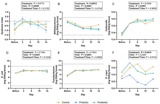 Dysbiosis index (A) and selected fecal bacterial abundance (log DNA/gram feces) [Bifidobacterium (B), Collinsella (C), E. coli (D), Fusobacterium (E), and P. copri (F)] of live B. pumilus SG154 or L. paracasei 327 postbiotic-supplemented dogs before and after an abrupt diet change. Samples were collected before and 2, 6, 10, and 14 days after the diet change.