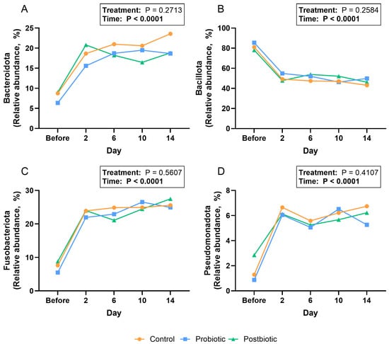 Relative abundances (% of sequences) of the main bacterial phyla [Bacteroidota (A), Bacillota (B), Fusobacteriota (C), and Pseudomonadota (D)] in feces of live B. pumilus SG154 or L. paracasei 327 postbiotic-supplemented dogs before and after an abrupt diet change. Samples were collected before and 2, 6, 10, and 14 days after the diet change.
