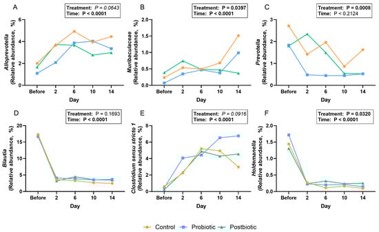 Relative abundances (% of sequences) of selected bacterial taxa [Alloprevotella (A), Muribaculaceae (B), Prevotella (C), Blautia (D), Clostridium_sensu_stricto_1 (E), and Holdemanella (F)] in feces of live B. pumilus SG154 or L. paracasei 327 postbiotic-supplemented dogs before and after an abrupt diet change. Samples were collected before and 2, 6, 10, and 14 days after the diet change.