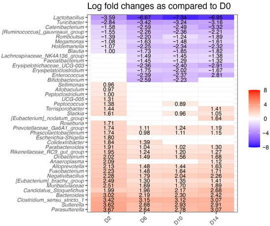 Following diet change, the relative abundances of four bacterial phyla and ~40 bacterial genera were altered (Figure 7 and Figure 8; Supplementary Table S2). Three bacterial genera were affected by treatments following a diet change. Dogs supplemented with live B. pumilus SG154 had a lower (p < 0.05) fecal Muribaculaceae relative abundance than control dogs (Figure 8B). Similarly, dogs supplemented with live B. pumilus SG154 had a lower (p < 0.001) fecal Prevotella relative abundance than controls or dogs supplemented with the L. paracasei 327 postbiotic (Figure 8C). Dogs supplemented with live B. pumilus SG154 or L. paracasei 327 postbiotic had a higher (p < 0.05) fecal Holdemanella relative abundance than controls (Figure 8F). Finally, fecal Alloprevotella (Figure 8A), Clostridium_sensu_stricto_1 (Figure 8E), Oribacterium, Tyzzerella, and UCG-005 tended (p < 0.10) to be affected by treatment. The ANCOMBC analysis revealed that the abrupt diet change led to an increase in Prevotellacaeae Ga6A1, Phascolarctobacterium, Parabacteroides, the Rikenellaceae RC9 gut group, Oribacterium, Alloprevotella, Fusobacterium, Negativibacillus, the Eubacterium brachy group, Muribaculaceae, Candidatus Stoquefichus, Bacteroides, Clostridium sensu stricto 1, Sutterella, and Parasutterella at all time points and a decrease in Lactobacillus, Turicibacter, Catenibacterium, the Ruminococcus gauvreauii group, Romboutsia, Megamonas, Holdemanella, Blautia at all time points (Figure 9). The abrupt diet change also led to a decrease in the Lachnospiraceae NK4A136 group, Faecalibacterium, Erysipelotrichaceae UCG-003, Erysipeloclostridium, and Enterococcus on D6, D10, and D14. Treatment affected only two genera. Dogs fed B. pumilus SG154 had a lower relative abundance of Prevotella, while dogs fed the L. paracasei 327 postbiotic had a lower relative abundance of Oscillospira.