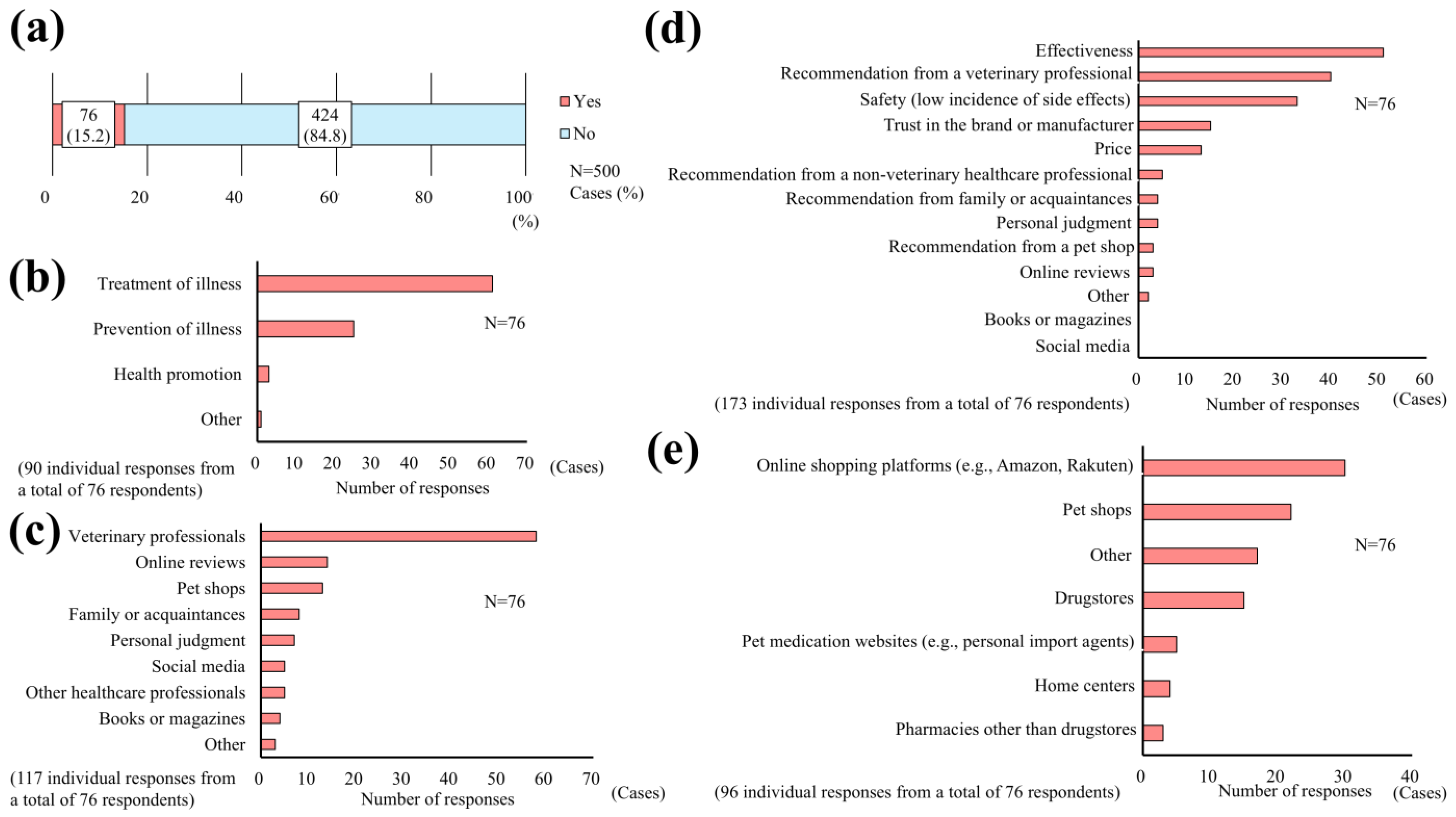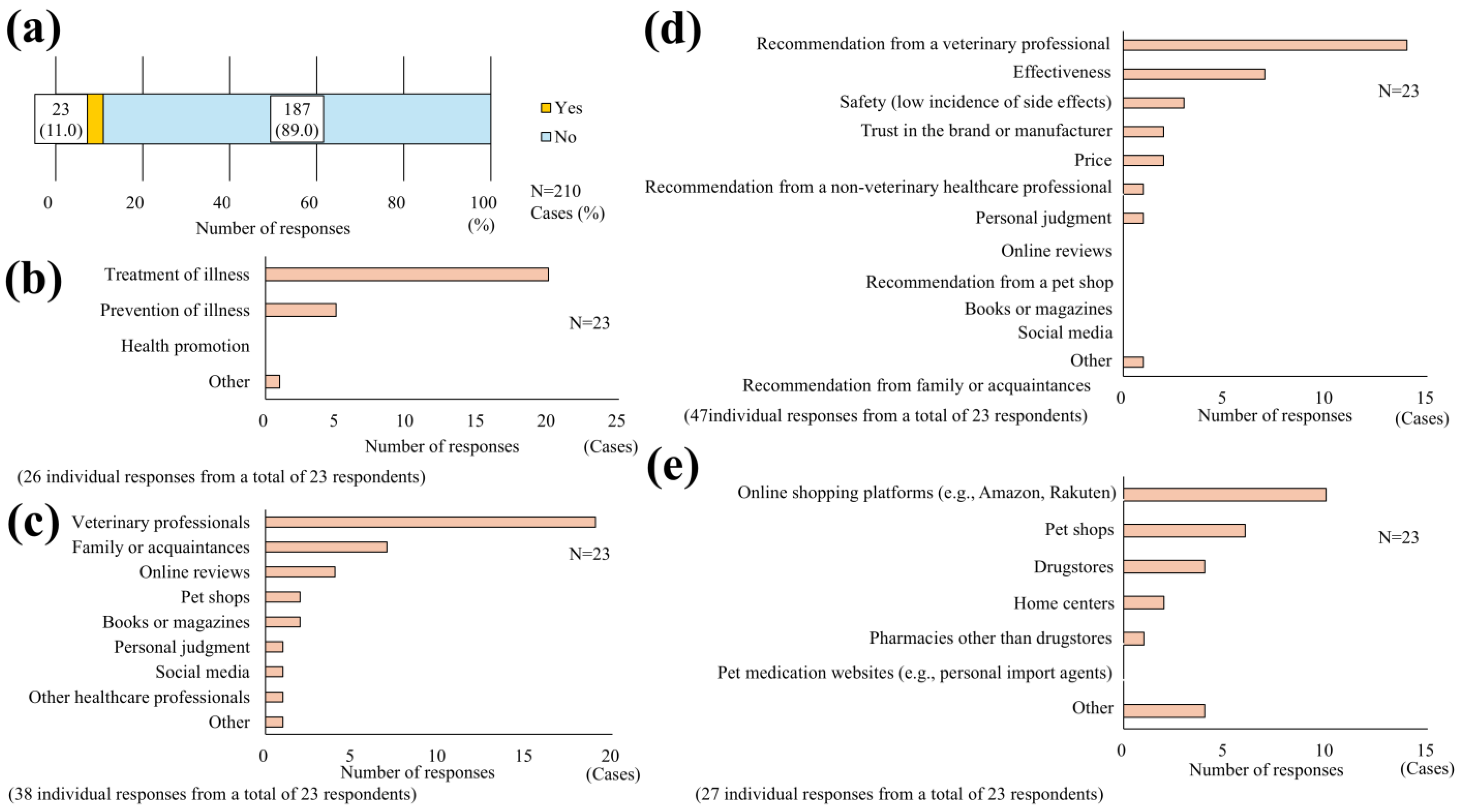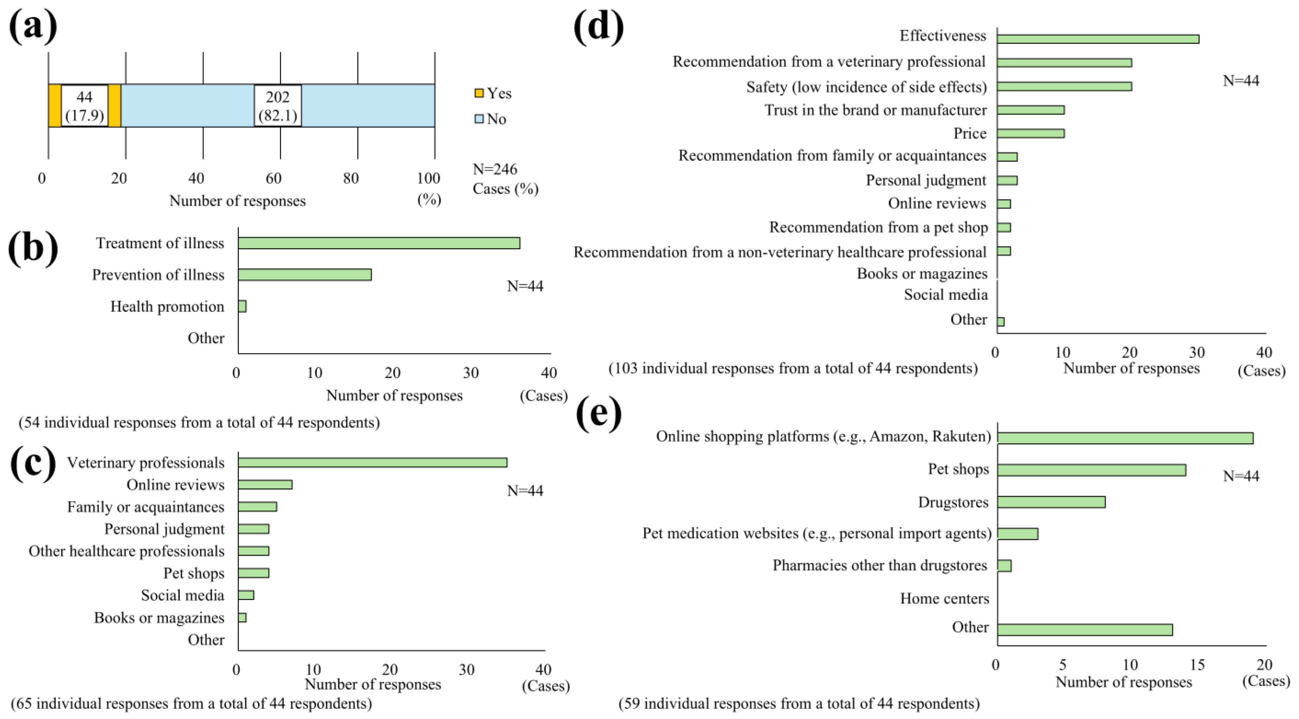 APA StyleKonno, T., Kikuchi, D., Suzuki, H., Nishikawa, Y., Kisara, S., Nakamura, H., & Murai, Y. (2025). Self-Medication Practices for Companion Animals in Japan: A Descriptive Survey of Pet Owners’ Use of Over-the-Counter Drugs and Perspectives on Pharmaceutical Care. Pets, 2(4), 39. https://doi.org/10.3390/pets2040039